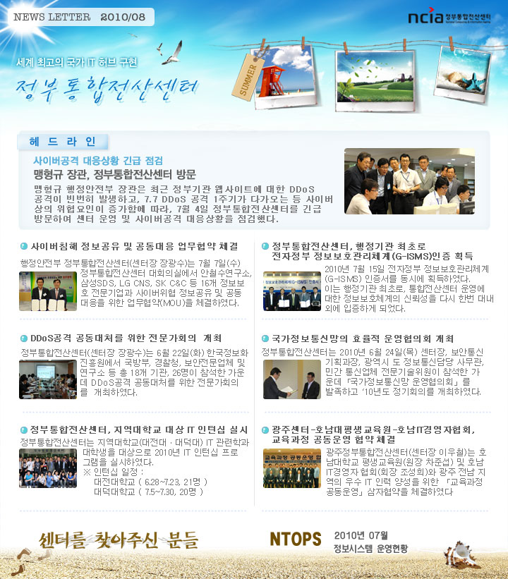 맹형규 장관, 정부통합전산센터 방문 - 사이버공격 대응상황 긴급 점검 사이버침해 정보공유 및 공동대응 업무협약 체결 「DDoS공격 공동대처를 위한 전문가회의」 개최 정부통합전산센터, 지역대학교 대상 IT 인턴십 실시 전자정부 정보보호관리체계(G-ISMS)인증 획득 국가정보통신망의 효율적 운영을 위한 운영협의회 개최 광주센터-호남대평생교육원-호남IT경영자협회, 교육과정 공동운영 협약 체결 우리 센터를 찾아주신 분들 2010년 7월 정보시스템 운영현황