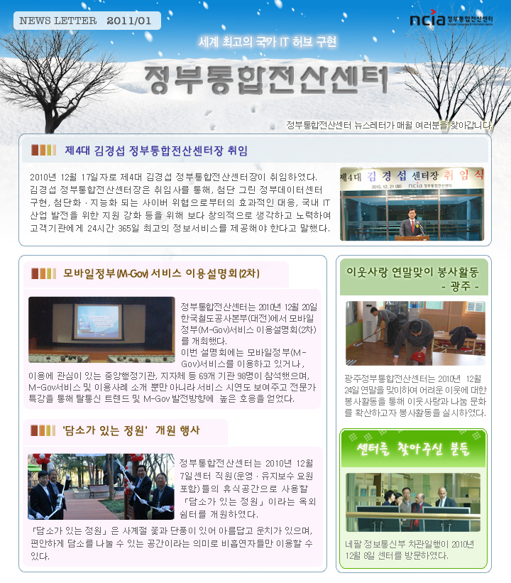 제4대 김경섭 정부통합전산센터장 취임 모바일정부(M-Gov) 서비스 이용설명회 담소가 있는 정원 개원 행사 이웃사랑 연말맞이 봉사활동(광주) 우리 센터를 찾아주신 분들 지난 뉴스레터보기(새창) 정부통합전산센터(새창) 행정안전부(새창) 서비스데스크:1577-0577