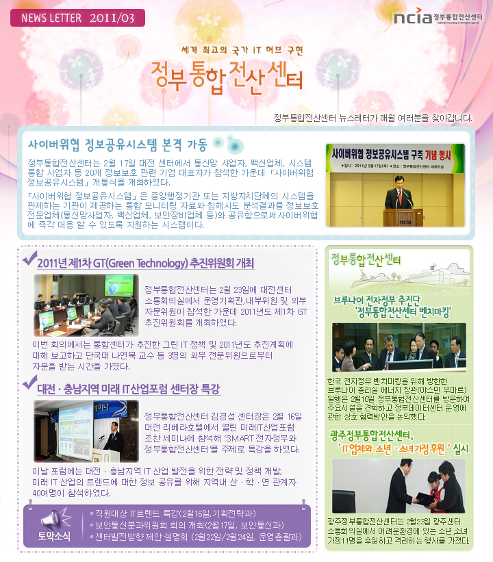사이버위협 정보공유시스템 본격 가동 2011년 제1차 GT(Green Technology) 추진위원회 개최 대전ㆍ충남지역 미래IT산업협회 포럼 원장 특강 실시 브루나이 전자정부 추진단 정부통합전산센터 벤치마킹 광주정부통합전산센터, IT업체와 소년ㆍ소녀 가정 후원 지난 뉴스레터보기(새창) 정부통합전산센터(새창) 행정안전부(새창) 서비스데스크:1577-0577