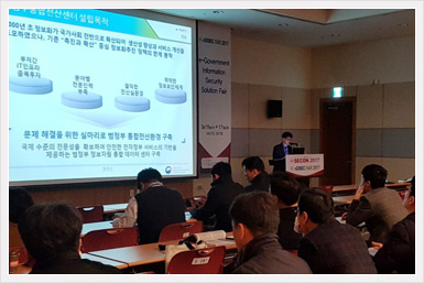 사이버안전과 신익성 사이버안전기획팀장은 행정자치부가 주관하고, 보안뉴스 공공부문발주자협의회가 주최한 『2017 전자정부 정보보호 솔루션 페어』 컨퍼런스에서 센터 사이버보안체계를 소개하였다. 센터 업무에 대한 높은 관심을 반영하듯 이 자리에는 공공기관 및 정보보안업체 등 약 120명이 모였다.