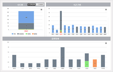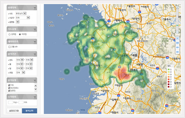 데이터를 경계맵 또는 히트맵으로 지도에 표시하여 한눈에 지역별 현황을 확인할 수 있으며, 더불어 유형 및 지역별