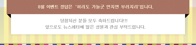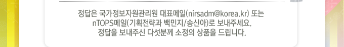 event퀴즈: 햄버거의 색깔은 무엇일까요?정답은 국가정보자원관리원 대표메일 또는 nTOPS메일(기획전략과 백민지,송신아)로 보내주세요.정답을 보내주신 다섯분께 소정의 상품을 드립니다. 이벤트 당첨자를 발표합니다! 고*필(k*g*i*),최*렬(c*o*s*1*),조*희(w*o*a*c*) 8월 이벤트 정답은 '허리도 가늘군 만지면 부러지리'입니다. 당첨되신분들 모두 축하드립니다!  앞으로도 뉴스레터에 많은 성원과 관심 부탁드립니다.